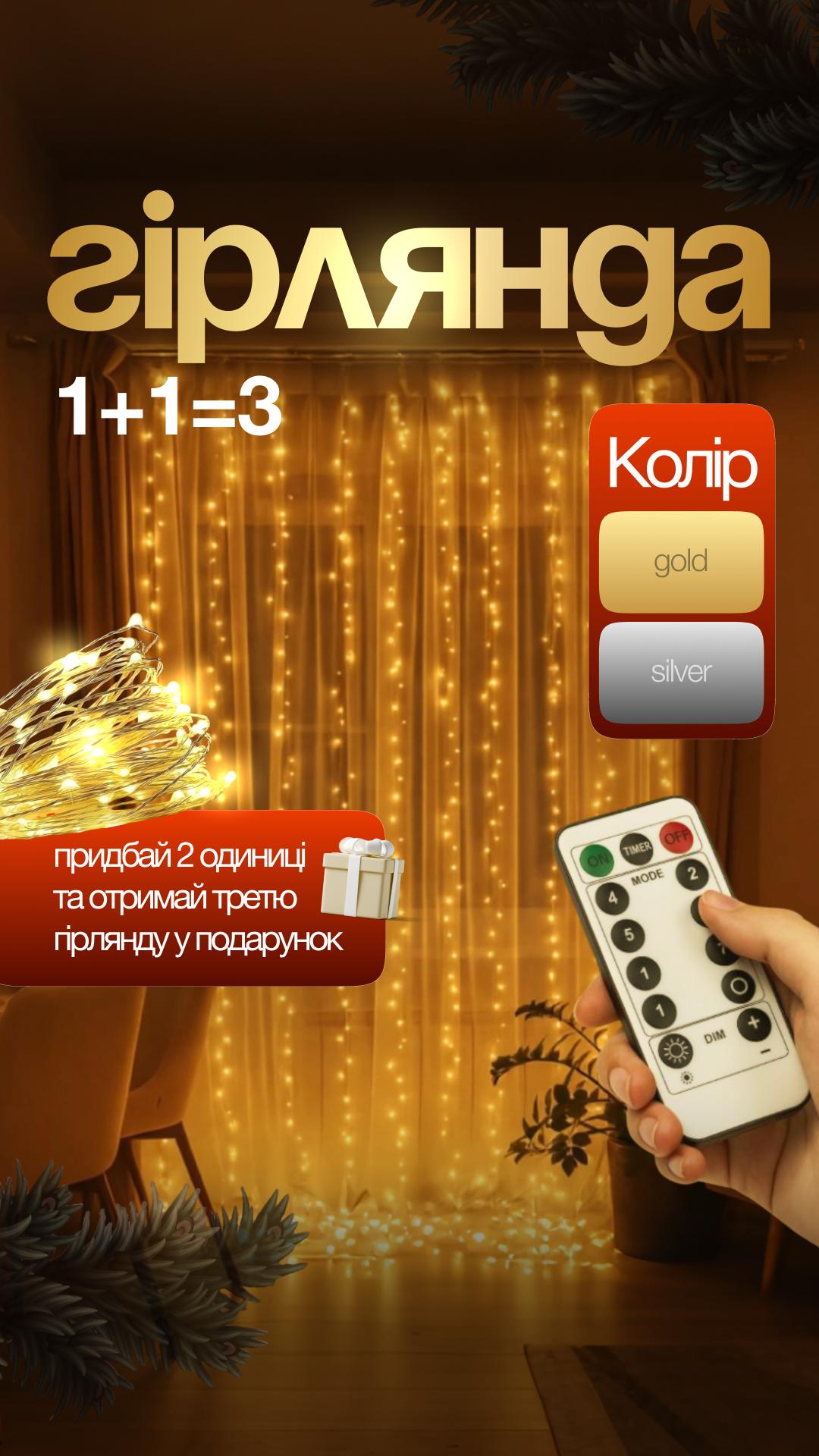 Гірлянда-штора – ідеальне рішення для створення святкової атмосфери. Такий варіант підійде для декорування вікон та арок, оформлення фотозон, а також як додаткове джерело освітлення, яке допоможе у створенні затишної романтичної обстановки.